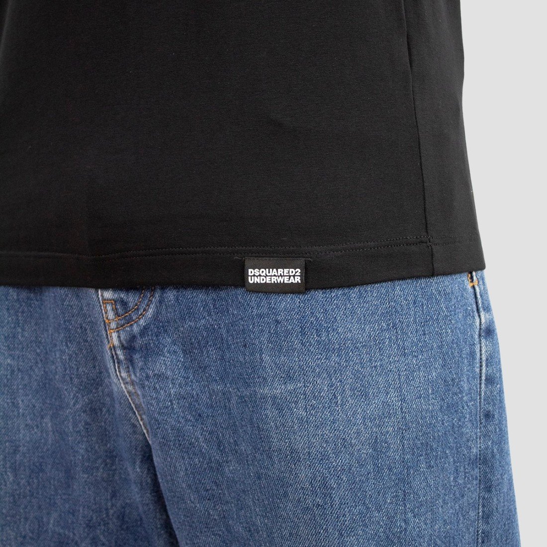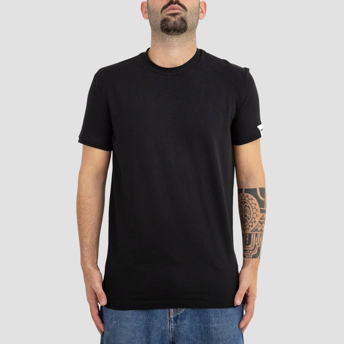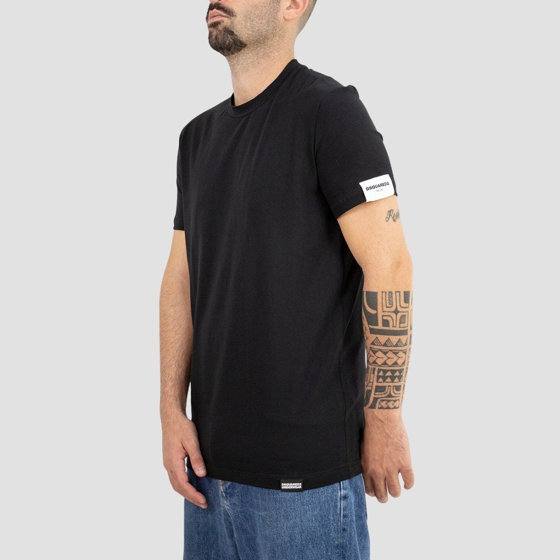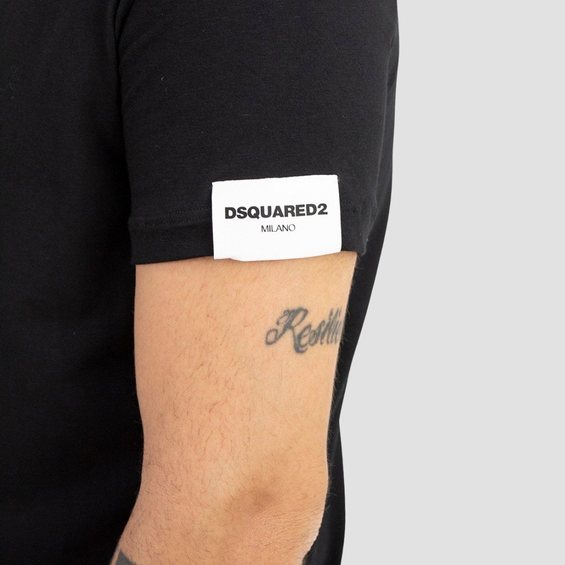 DSQUARED2 – T-shirt in cotone ed elastan nero con logo lettering stampato sulla manica sinistra e patch logo cucita sull’orlo inferiore. Girocollo a costina. Vestibilità slim e lunghezza tradizionale.