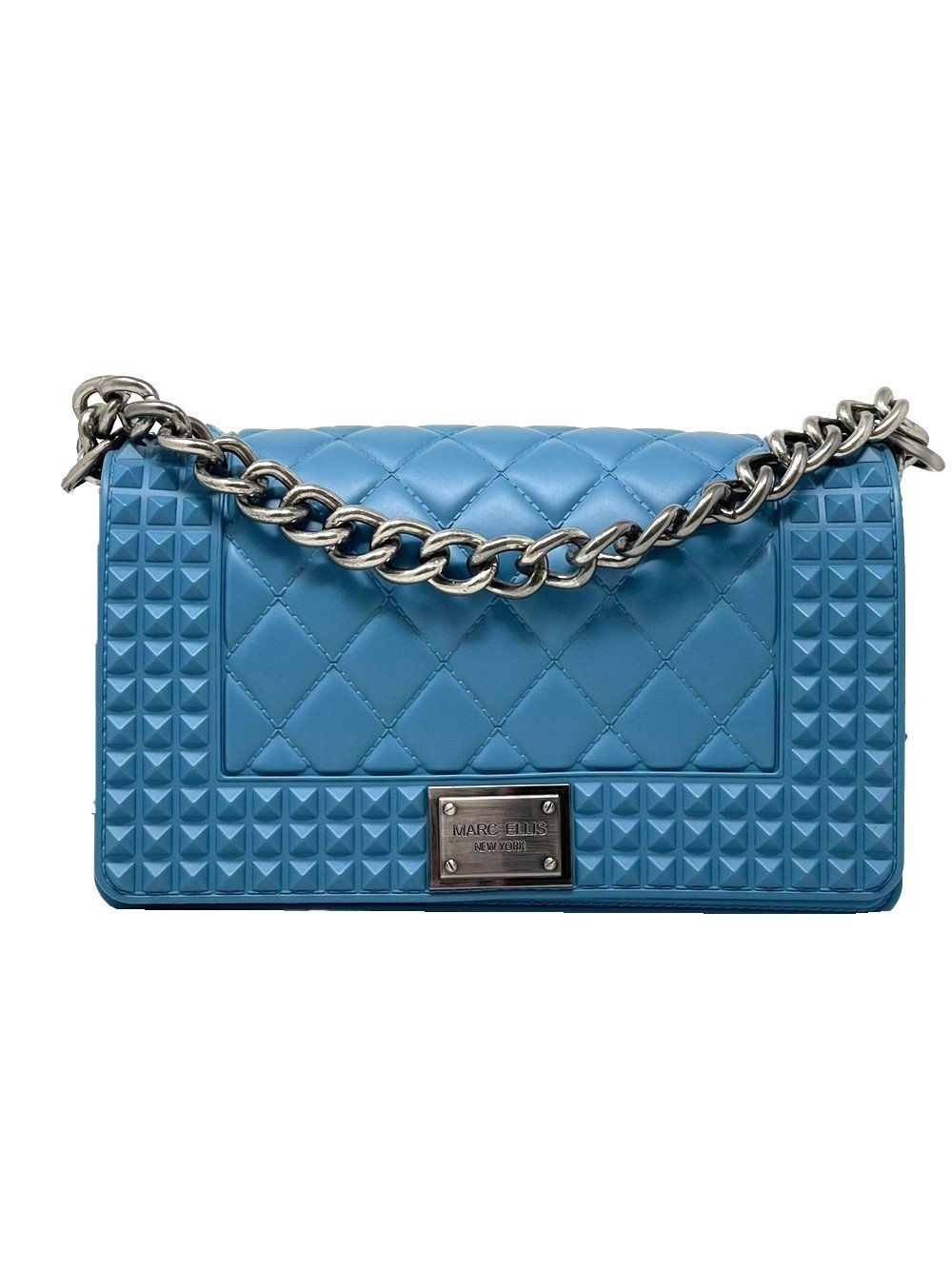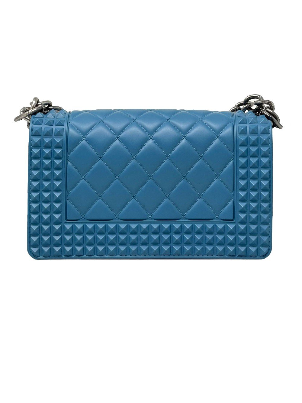 Borsa in pvc con borchie e chiusura magnetica. Targhetta logata in metallo frontale. Dotata di tracolla in pvc e catena.